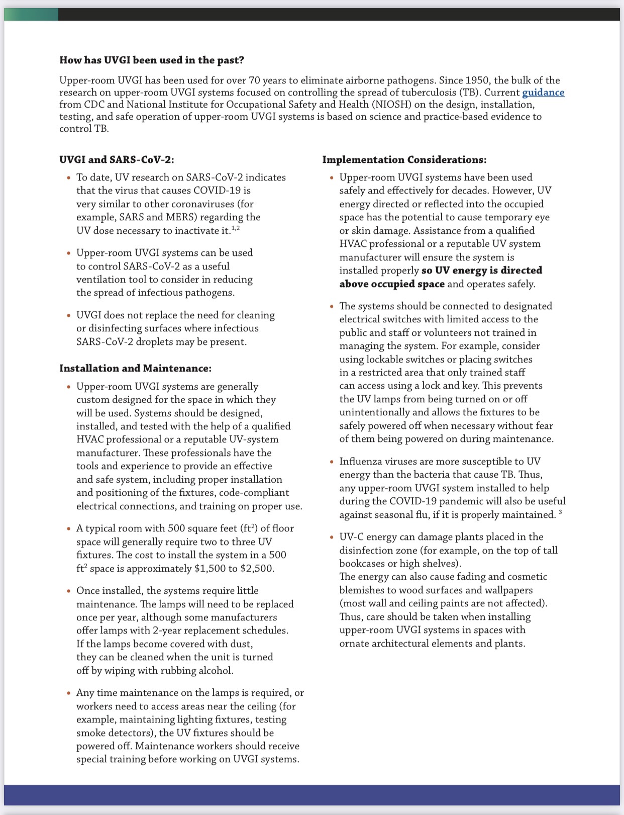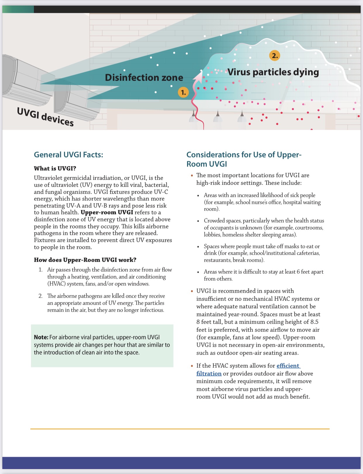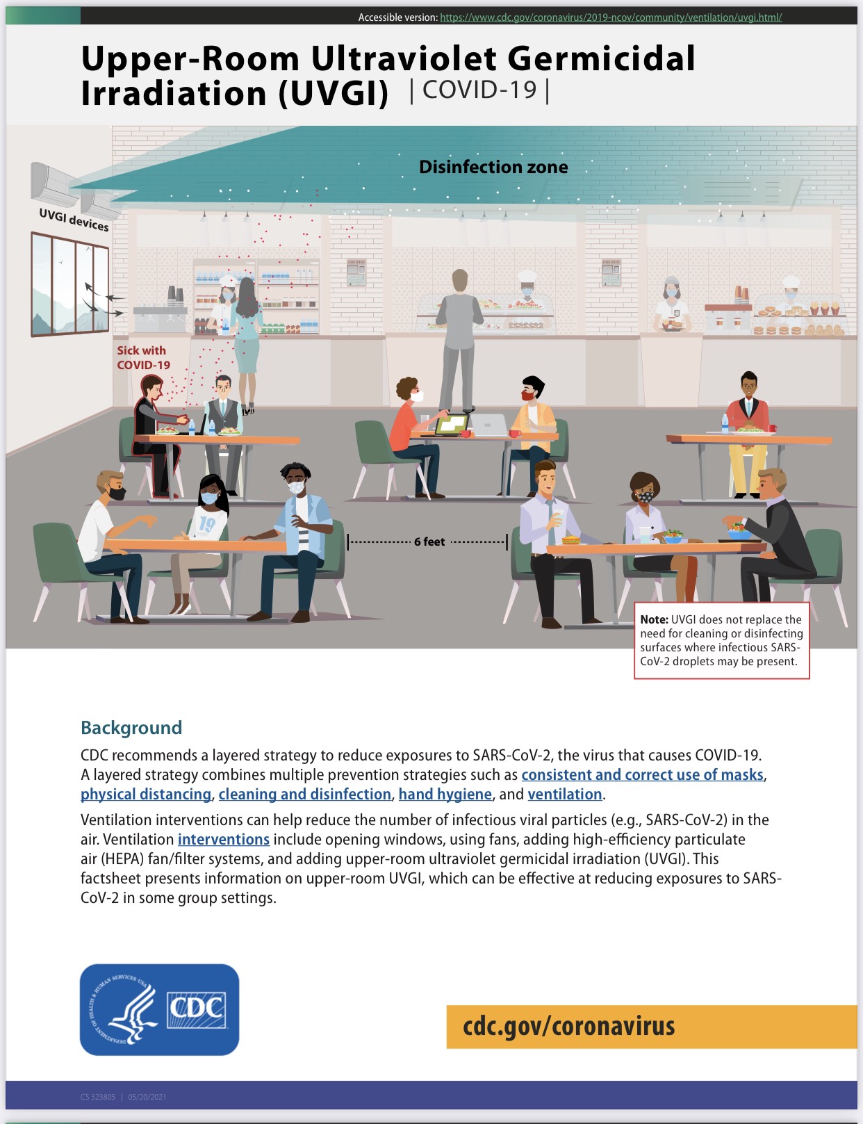 Tờ thông tin này trình bày thông tin về UVGI vùng trên căn phòng, có thể có hiệu quả làm giảm phơi nhiễm SARS-CoV-2 trong một số cơ sở sinh hoạt theo nhóm.